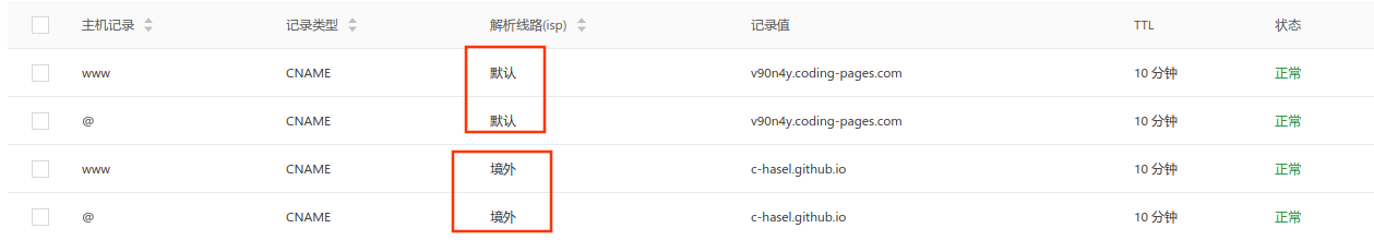 与coding绑定域名同理,但是在解析线路哪里要设置成境外,这样才能达到分流的效果
