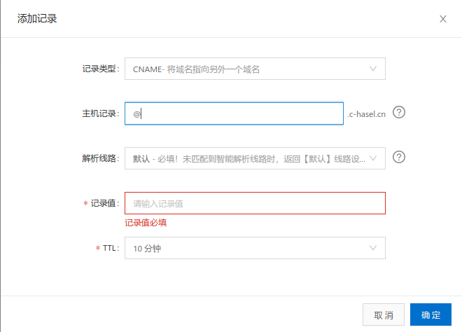 添加两条记录类型为CNAME,主机类型分别为www和@,记录值为coding给你的很长一串的域名,注意不要http