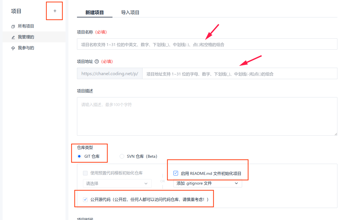 - 首先在coding上注册账号,然后新建一个项目,项目必须填:你的用户名.coding.me。![]()